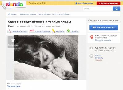 «Здам в оренду котиків та теплі пледи» – оголошення з таким заголовком з’явилося на сайті оголошень Slando. В такий спосіб винахідливі українці намагаються звільнити співвітчизників від осінньої хандри та самотності.
