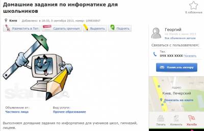 Так, киянин Георгій готовий виконувати завдання по інформатиці, а Євгеній з Дніпропетровська – з математики. Розцінки на свої послуги вони встановлюють в залежності від складності завдання, проте завіряють, що беруть недорого. Є і пропозиції універсальних «виконавців». Їм можна відправляти завдання з усіх предметів.