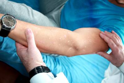 Псоріаз – це хронічне захворювання шкіри, яке розвивається на основі спадкової схильності під дією різних пускових чинників, основний з яких – стрес. Також «запустити» псоріаз можуть інфекційні захворювання, гормональні розлади, ожиріння, зловживання алкоголем, куріння. Захворювання супроводжується висипаннями на шкірі у вигляді червоно-рожевих потовщених бляшок, з вираженим лущенням на поверхні. У суттєвої частини пацієнтів (15-30%) захворювання може прогресувати із розвитком запального ураження суглобів – псоріатичного артриту.