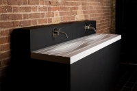 - Характеризуется отсутствием микропор, что делает его гигиеничным, простым в уходе, обеспечивает легкость в чистке и дает дополнительные преимущества при использовании в ванных комнатах, а также, в качестве кухонных столешниц.