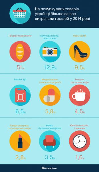 За підсумками 2014 року на частку оплати покупок в продуктових магазинах і супермаркетах припадає 51% від загальної суми витрат держателів пластикових карток, при цьому витрати українців на їжу в порівнянні з 2013 роком трохи скоротилися – на 1,6% (інфографіка).