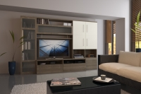 Очень часто, в гостиной, используют корпусную мебель. Она выступает в качестве стеллажей и стенок, сервантов и буфетов, книжных шкафов и настенных полок.