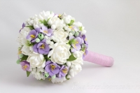 - Создавая свадебный букет вы можете применять не только лишь одни цветы, а и такие декоративные элементы, как: цепочки, бисер, ткани, стразы. Но помните, что использование различных декоративных элементов и цветов далеко не всегда оправданно. Зачастую, даже один, но правильно подобранный к свадебному платью, цветок может выглядеть достаточно гармонично и ошеломляюще. Сам по себе букет может быть собран из полевых либо садовых цветов;