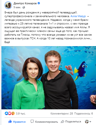 Ведучи «Світ навиворіт» Дмитро Комаров: «Вчора був день народження у неймовірної телеведучої, суперпрофесіонала і чудової людини. Алла Мазур - легенда українського телебачення. Нещодавно, коли у мене брали інтерв'ю до 25-річчя телеканалу 1+1 і запитали, з ким насамперед у мене асоціюється канал, я не замислюючись назвав ім'я Алли. В житті Алла Мазур така ж, як на екрані - дуже щира, справжня, неймовірно ерудована, розумна, і при цьому скромна. Я дуже люблю з нею поговорити, коли ми перетинаємося по роботі. Аллочко, вітаю, нехай в житті будуть лише перемоги. У всіх сферах життя. Перш за все здоров'я. Друзі, приєднуйтеся до привітань в коментарях!».