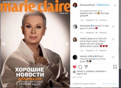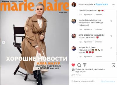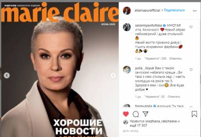 Під публікаціями Алли Мазур з вражаючими світлинами «Marie Claire» її колеги, друзі, глядачі писали привітання та слова захвату. Алла подарувала всім неймовірні позитивні емоції, які дуже потрібні зараз кожному з нас.