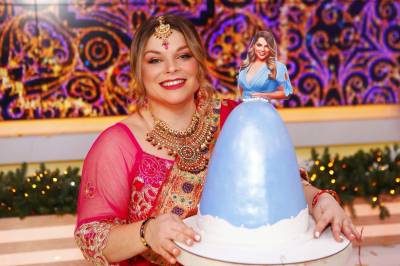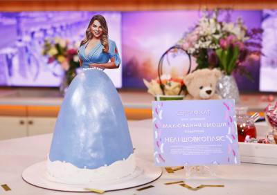 Єгор виніс Нелі незвичайний торт для справжньої принцеси. На фотографії зображена телеведуча в блакитному вбранні, а сам торт — продовження неймовірної сукні прикрашеної перлами. Легкий ніжний торт з йогуртово-малиновою начинкою підготували спеціально до дня народження телезірки.
