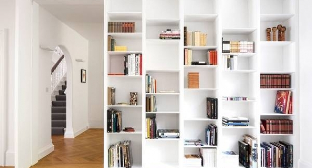 - Книжные шкафы-разделители. Вы можете выбрать книжные шкафы-разделители в зависимости от высоты потолка и количества имеющейся у вас коллекции книг. Эффект лестницы и необычные узоры книжных шкафов-разделителей визуально привлекательны.