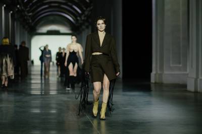 На подіум Марічка вийшла у чоловічому піджаку, який був зроблений під сукню, з правої сторони одяг прикрашала довга бахрома з еко-шкіри на одній кишені, довершенням образу став широкий пояс на талії.