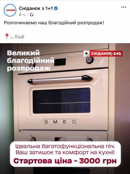 Відкрила благодійний аукціон ідеальна багатофункціональна піч від найкращого італійського бренду SMEG. Духова піч серії Victoria кремового кольору з емальованої сталі, комбінована з пароваркою і має парову систему очищення. А ще вона була неодноразовою героїнею кулінарних сюжетів Сніданок з 1+1, майже не використовувалася, бачила як створюються смачні шедеври Сенічкіна, підглядала за його запальними танцями з Настею Каменських та слухала мелодійне соло Юлії Саніної. І головне — створювала затишок на кухні! Тепер готується стати частиною нової родини! Уже завтра, 21.04, оголосять щасливого власника!
