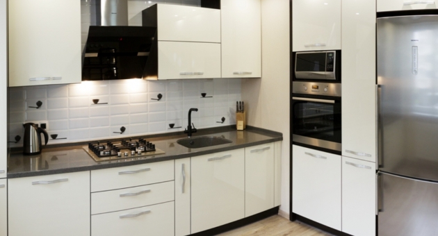 - Глянцевая поверхность. Это подойдет для маленьких кухонь, так как визуально расширяется пространство. Но запомните — не используйте красную мебель, выберите белый или бежевый цвет.
