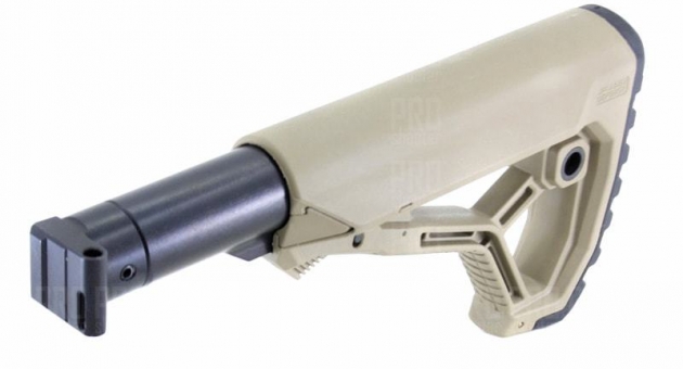 Вместе с телескопическим прикладом всегда идет эргономичная рукоять, которая сделанная из полиуретана. Размещен внутри у нее подпружиненный рычаг с металлической вставкой. Именно такая конструкция позволяет достаточно быстро изменять длину приклада. Алюминиевые сплавы и полимерные материалы используются для изготовления приклада. Он характеризуется большой износостойкостью, небольшим весом и значительной прочностью. Особая технология изготовления рукоятки и приклада, позволяет достигать шероховатость на их поверхности. Это необходимо для исключения скольжения рук, когда используют оружие.
