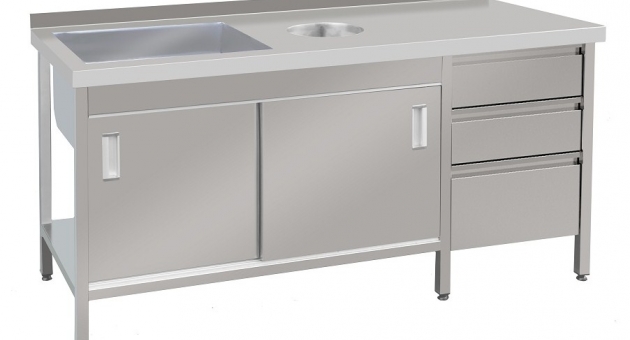 - Стіл для збору сміття. Оснащений спеціальним отвором, призначеним для установки ємності для відходів, що значно економить місце на професійній кухні.