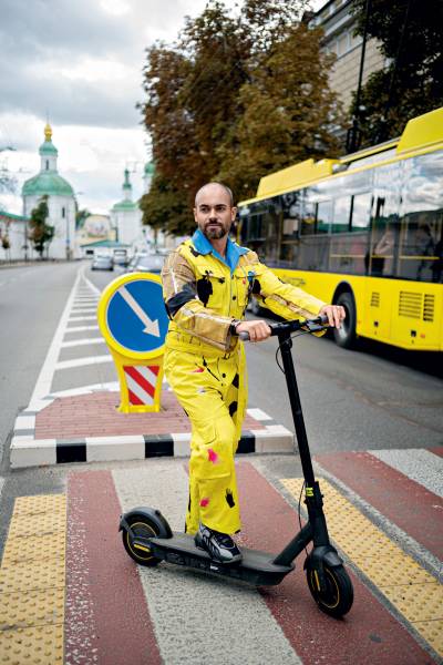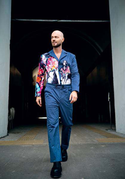 Продюсер шоу «Твій день» та член журі соціального проекту «Вдягни українське мистецтво» Єгор Гордєєв на фотосесії був у комбінезоні від бренду Overall з елементами стріт-арту від київського художника-мураліста Дмитра Фатума.