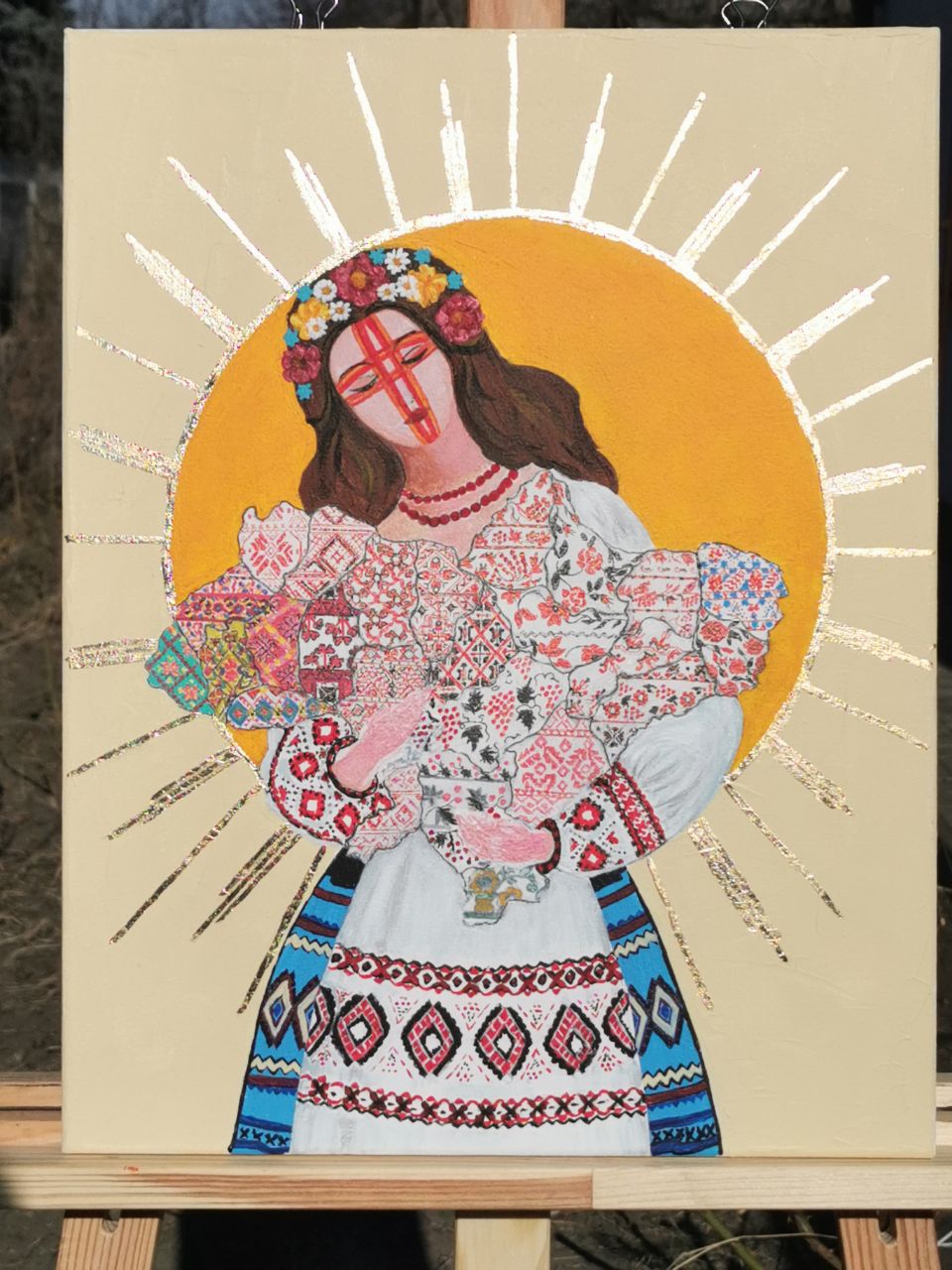 Картина написана акриловими фарбами на полотні 45х35 см, із застосуванням золотої поталі, яка підсилює світловий ефект, додаючи зображенню символічного сяйва.