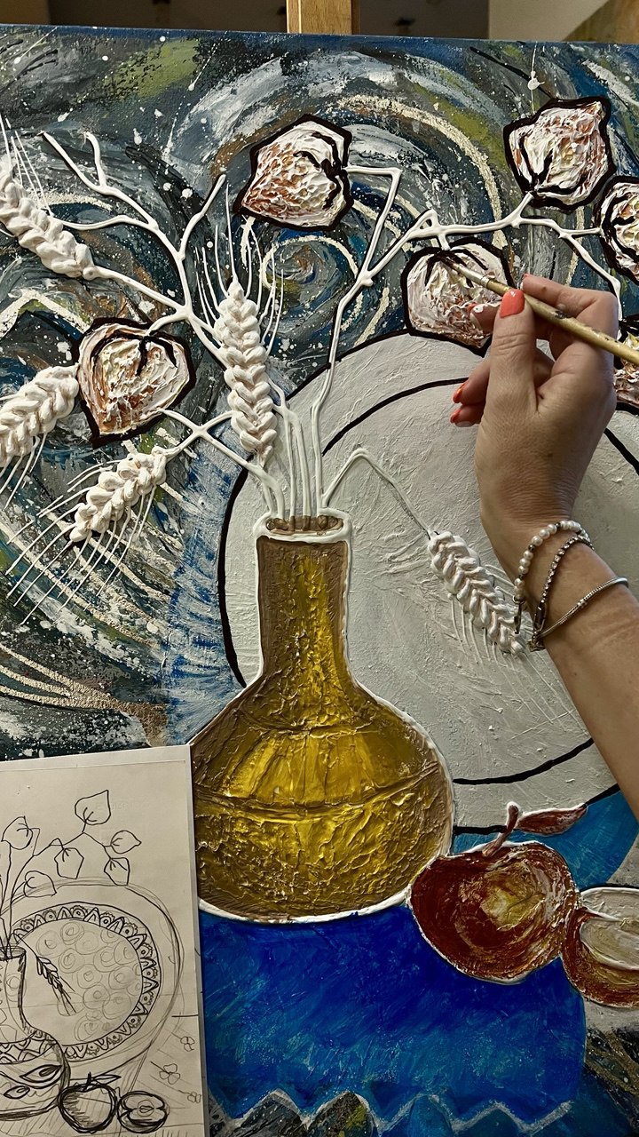 Вона «пише» пастою, як інші — словами. Її рельєфи — не випадкові, не декоративні. Вони — як гортання старого листа, де кожен залом має сенс. Її пальці ведуть за собою лінію, ніби спогад, що виринає з глибини пам’яті. У її картинах є спокій, який не втомлює, і енергія, що не штовхає.