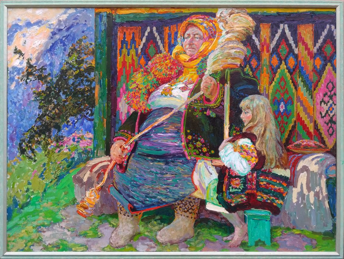 На полотні — пані Василина, карпатська берегиня, яка тримає в руках пряжу, дивиться у глибоку синь гір і, здається, веде розмову з вічністю. Поруч — її онучка. Одна передає досвід, інша — слухає не лише вухами, а всім єством. Це не просто родинна сцена — це акт ініціації, у якому знання про світ, любов до життя і біль втрат переплітаються в невидиму, але щільну нитку.