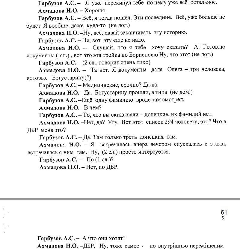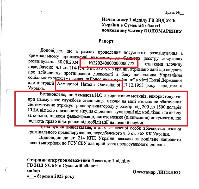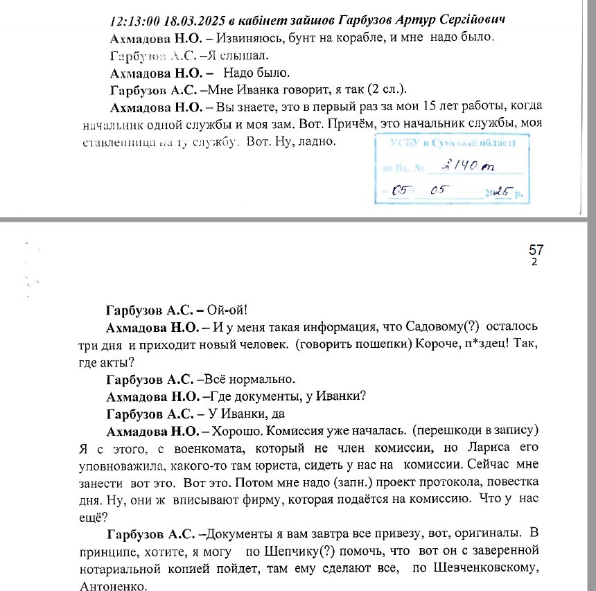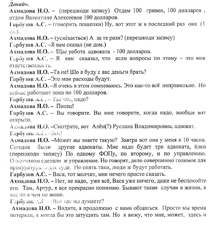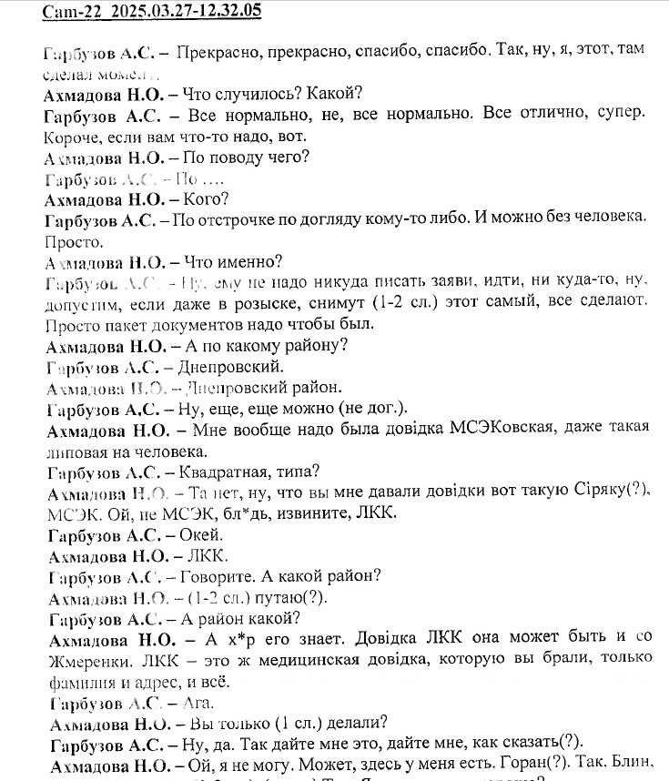 Марина Васильєва Що цікаво, це не єдиний епізод такої от незаконної спецслужбістської "роботи" Гарбузова за останній час. Так, в інтернеті з'явилися матеріали кримінальної справи щодо іншої ухилянтської схеми, у якій Гарбузов фігурує... як головний обвинувачений по статті 114-1, ч.1 Кримінального кодексу (Перешкоджання ЗСУ в особливий період; максимальне покарання — 8 років позбавлення волі). Судячи з матеріалів справи (див. нижче), які з'явилися в публічному просторі, Гарбузов організував через Управління соціального захисту населення Голосіївської РДА в м.Києві масову видачу довідок для ухилянтів. Його подільниця у справі — начальниця цього Управління Наталія Ахмадова. Серед сум, що фігурують у справі, та які зв'язка Гарбузов-Ахмадова отримали від ухилянтів вражає — 3 млн грн. І це тільки по одному з багатьох епізодів, про які стало відомо слідству і загалу.