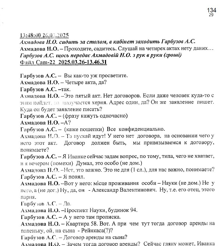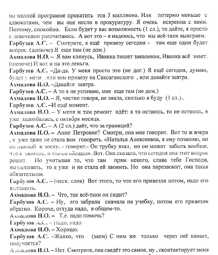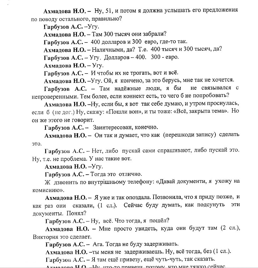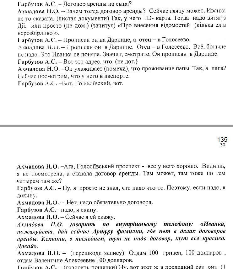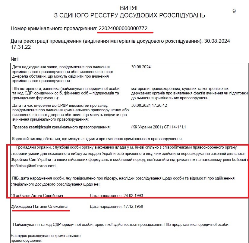 Марина Васильєва Що цікаво, це не єдиний епізод такої от незаконної спецслужбістської "роботи" Гарбузова за останній час. Так, в інтернеті з'явилися матеріали кримінальної справи щодо іншої ухилянтської схеми, у якій Гарбузов фігурує... як головний обвинувачений по статті 114-1, ч.1 Кримінального кодексу (Перешкоджання ЗСУ в особливий період; максимальне покарання — 8 років позбавлення волі). Судячи з матеріалів справи (див. нижче), які з'явилися в публічному просторі, Гарбузов організував через Управління соціального захисту населення Голосіївської РДА в м.Києві масову видачу довідок для ухилянтів. Його подільниця у справі — начальниця цього Управління Наталія Ахмадова. Серед сум, що фігурують у справі, та які зв'язка Гарбузов-Ахмадова отримали від ухилянтів вражає — 3 млн грн. І це тільки по одному з багатьох епізодів, про які стало відомо слідству і загалу.